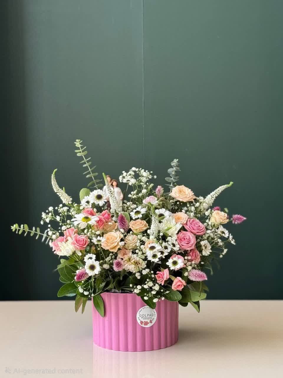 رز مینیاتور حس محبت و احترام را منتقل میکنند، ورونیکا و گل عروس لطافت و آرامش به باکس میدهند، و تاج خروس و داوودی انرژی، شور و رنگارنگی را به ترکیب اضافه میکنند. این ترکیب شاداب و چشمنواز، حس زندگی، عشق و قدردانی را به بهترین شکل به نمایش میگذارد.