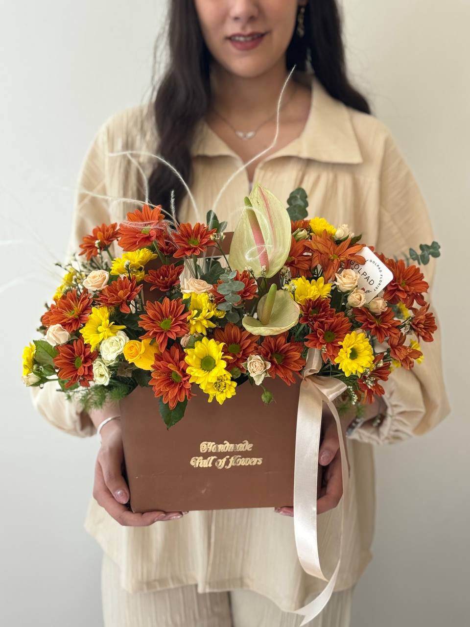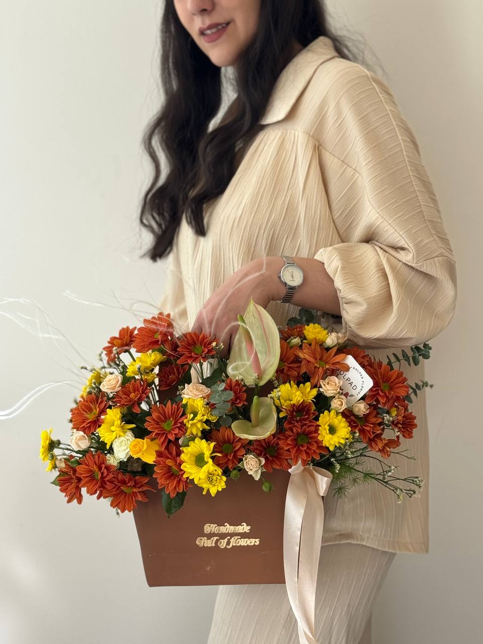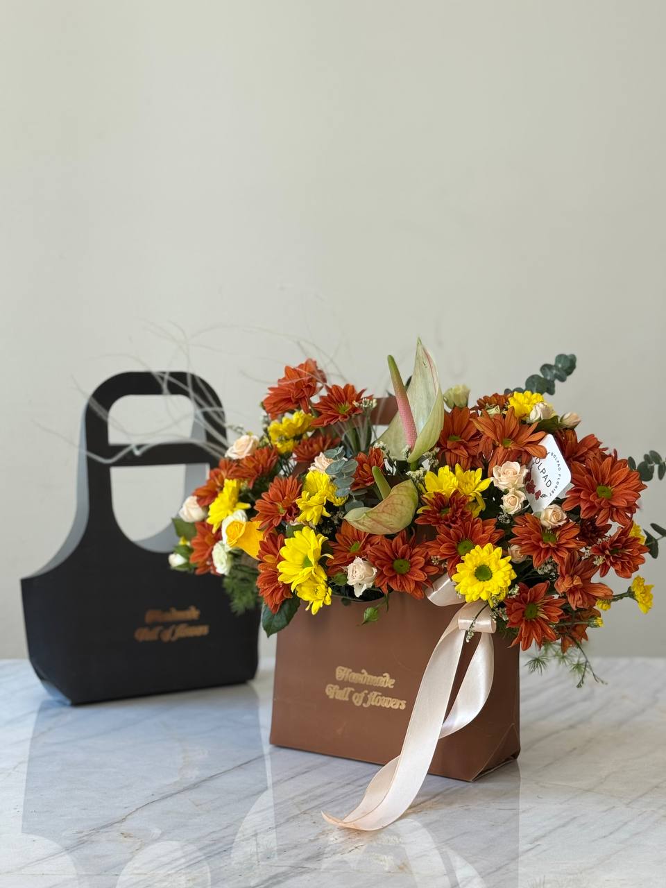 این بگ گل شامل گل داوودی با لطافت بینظیر، آنتریوم شیک، رز مینیاتور ظریف، رز کلاسیک و شمشاد سبز تازه است که ترکیبی از رنگ و انرژی مثبت ایجاد میکند.