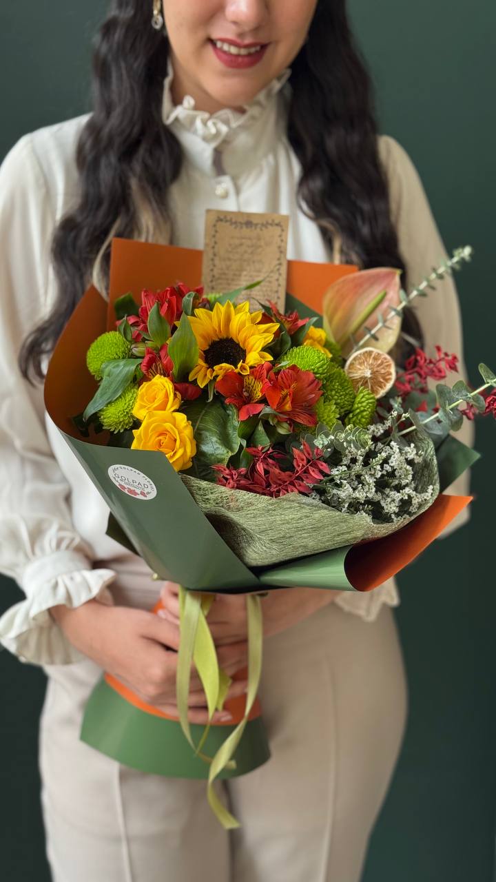 دستهگل یسرا با ترکیبی هماهنگ و پرانرژی از داوودی، آلستر، آفتابگردون، رز مینیاتور و آنتریوم طراحی شده است. آفتابگردونها حس گرما و شادی را منتقل میکنند، داوودیها و آلستر تعادل و بافت دلنشینی ایجاد میکنند، رزهای مینیاتور ظرافت و لطافت نهایی را اضافه میکنند و آنتریوم جلوهای لوکس و برجسته به دستهگل میبخشد.