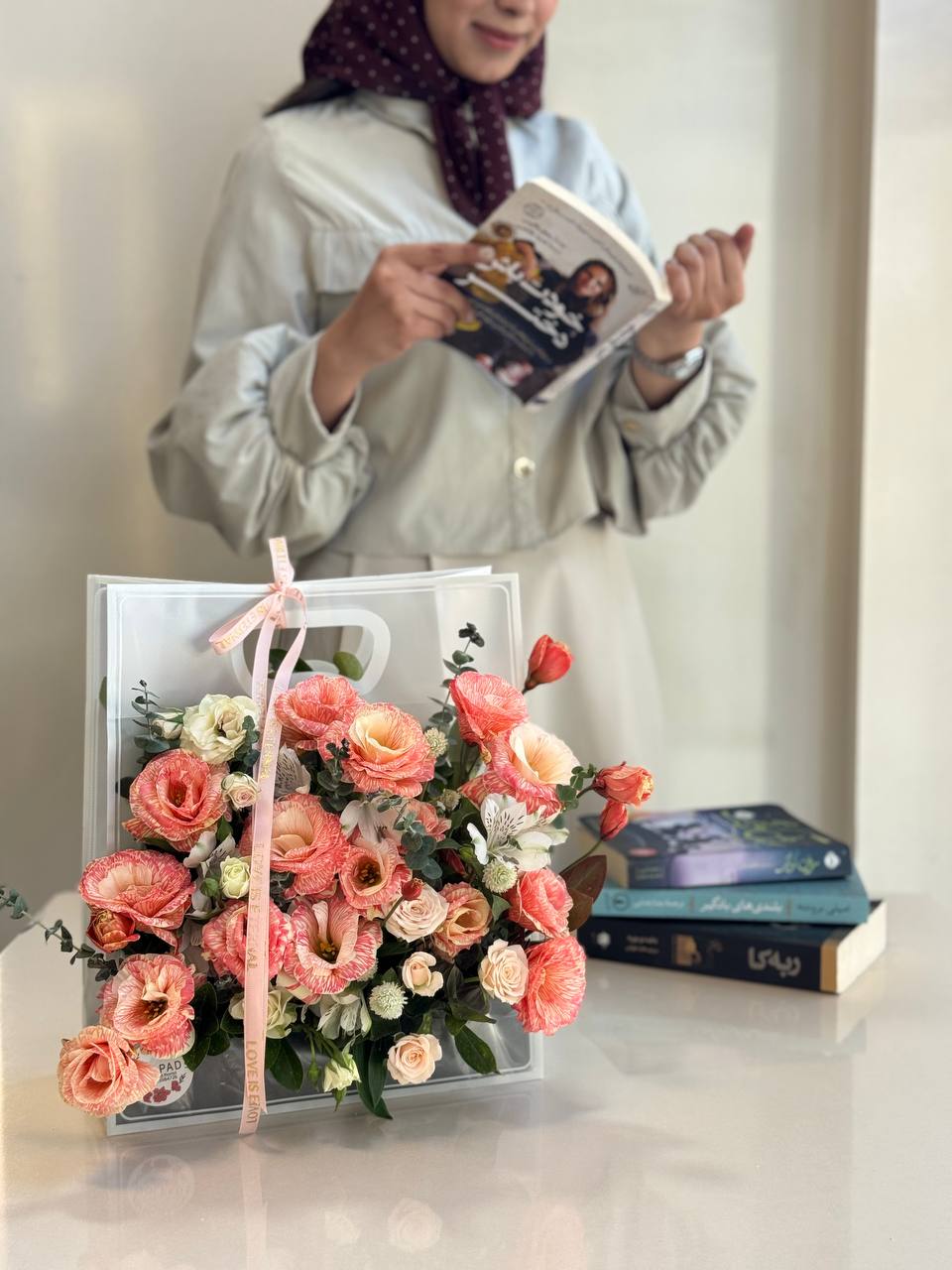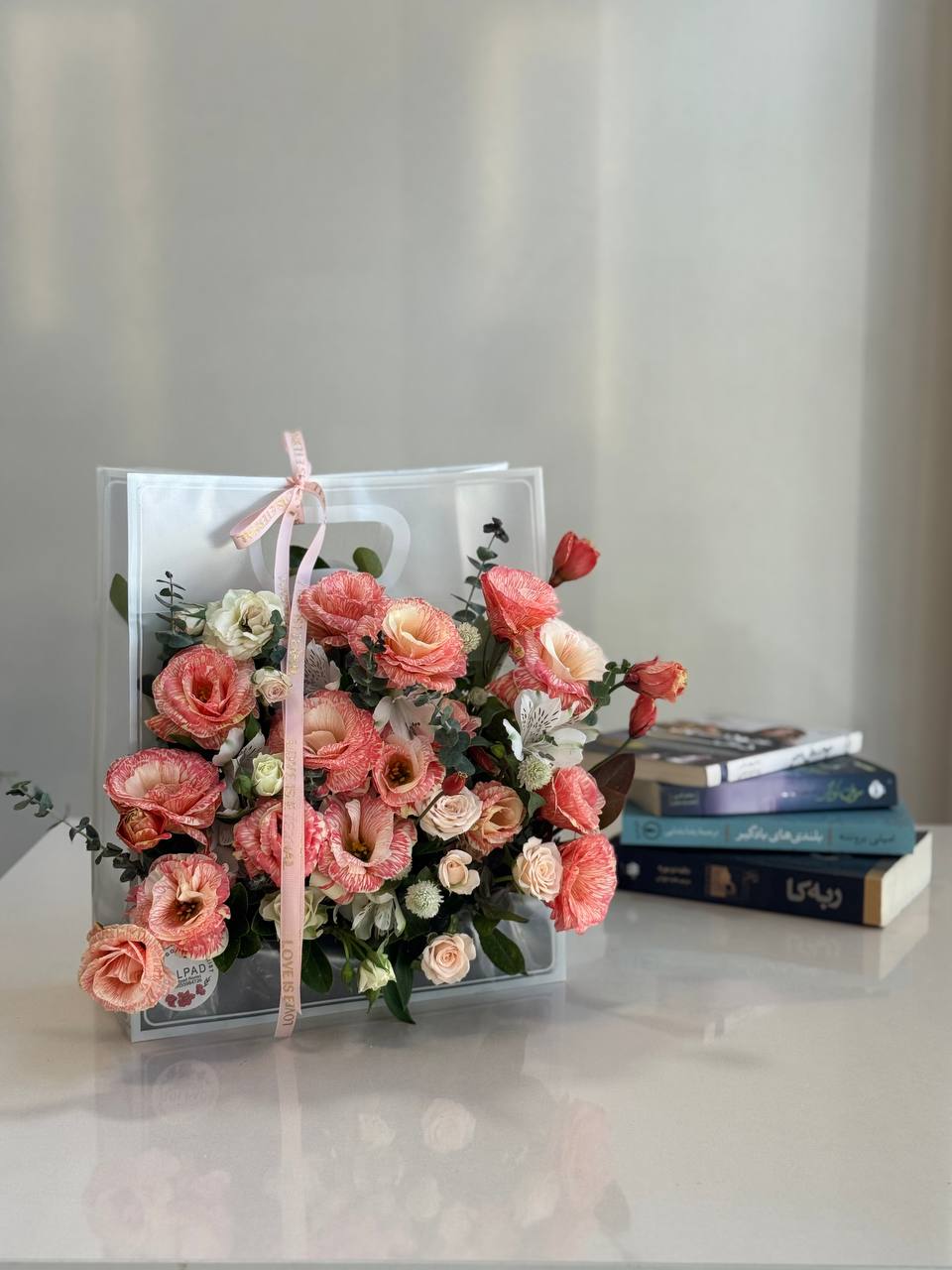 ترکیبی از گلهای آستر، لیسیانتوس و رز مینیاتوری که با رنگهای ملایم صورتی و سفید، حالوهوایی لطیف و دخترانه خلق کردهاند. این دستهگل نماد پاکی، عشق و ظرافت است، درست مثل دختری که دوستش داری.