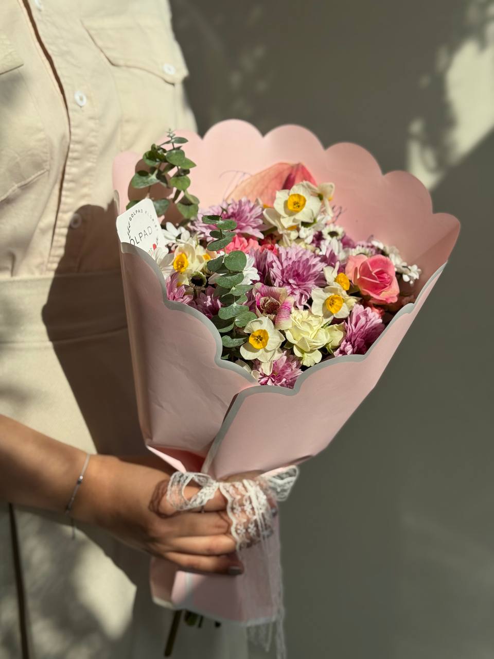 دسته گل هلیا با نرگسهای روشن، آلستر شیک، داوودی پرانرژی و رزهای مینیاتور ظریف؛ هدیهای لطیف، پرطراوت و خاطرهانگیز برای روز مادر.